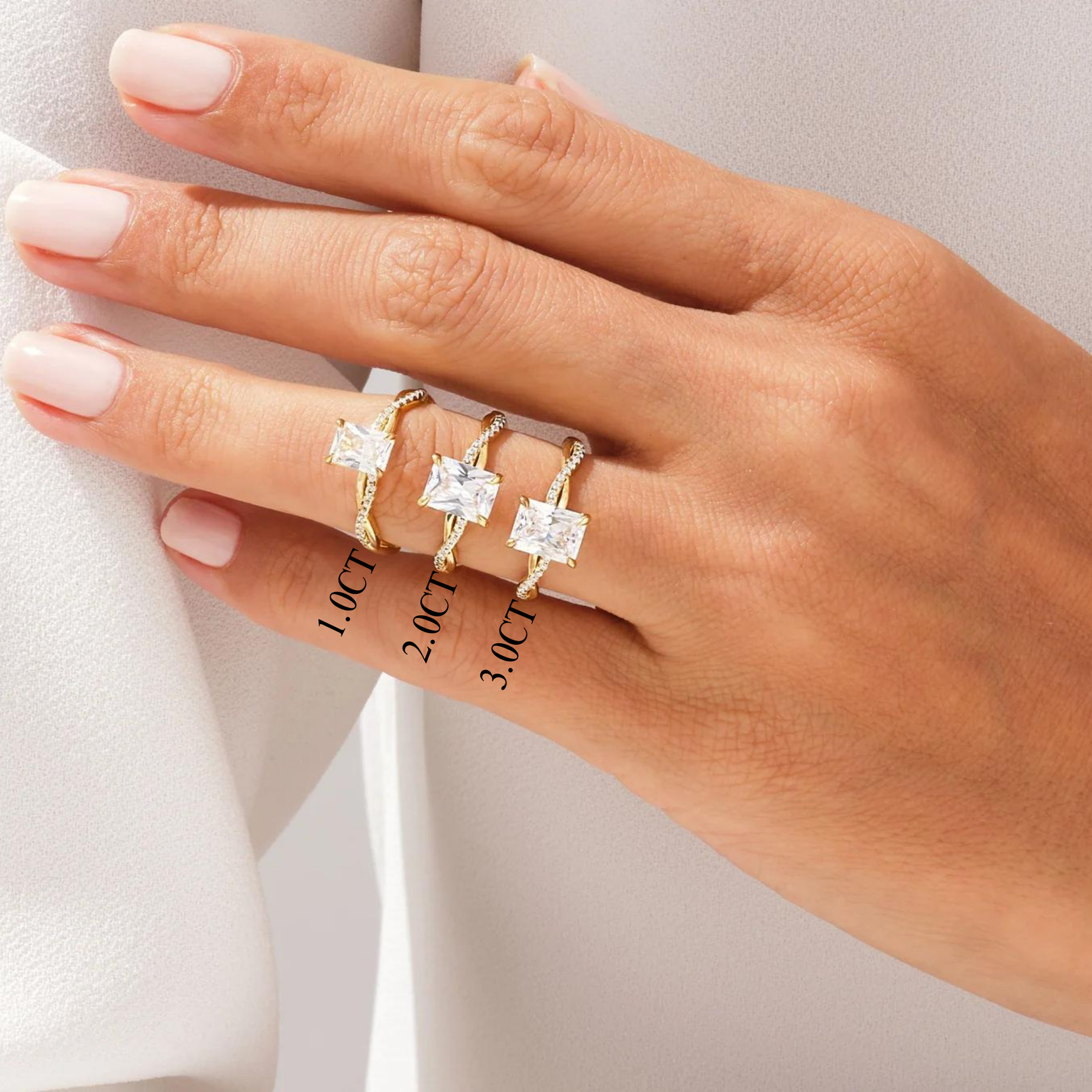 ✥This stunning 1.0CT Radiant Cut Moissanite Engagement Ring with a Twisted Pave Setting elegantly combines contemporary style with classic charm. The centerpiece features a dazzling radiant cut moissanite, known for its unique rectangular shape and brilliant facets that create a captivating sparkle. The intricately twisted band, adorned with shimmering pave-set stones, adds an artistic touch and enhances the overall brilliance of the ring. Ideal for those seeking a distinctive yet timeless engagement ring, this radiant cut moissanite offers a luxurious and affordable alternative to traditional diamonds, making it a perfect symbol of enduring love and commitment.