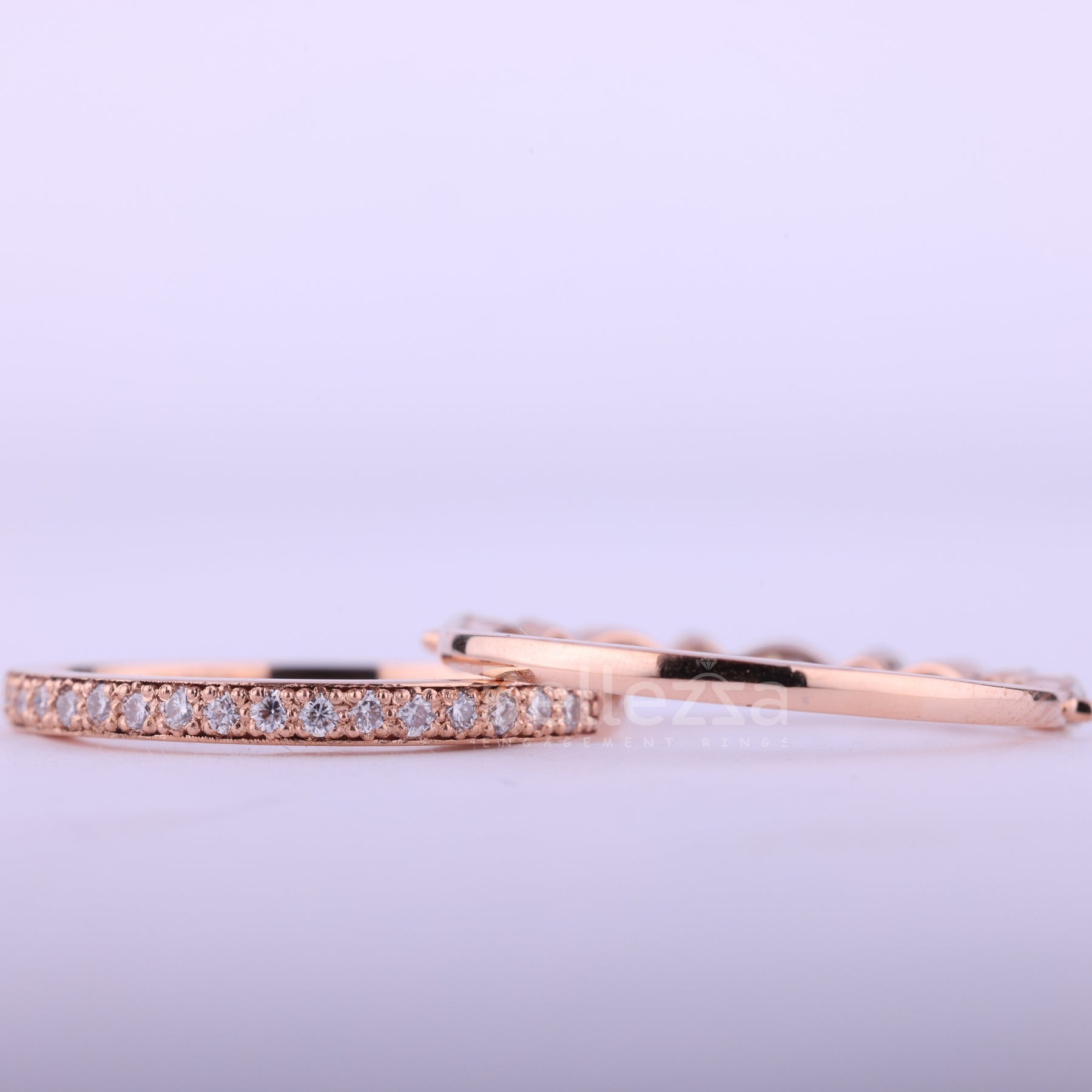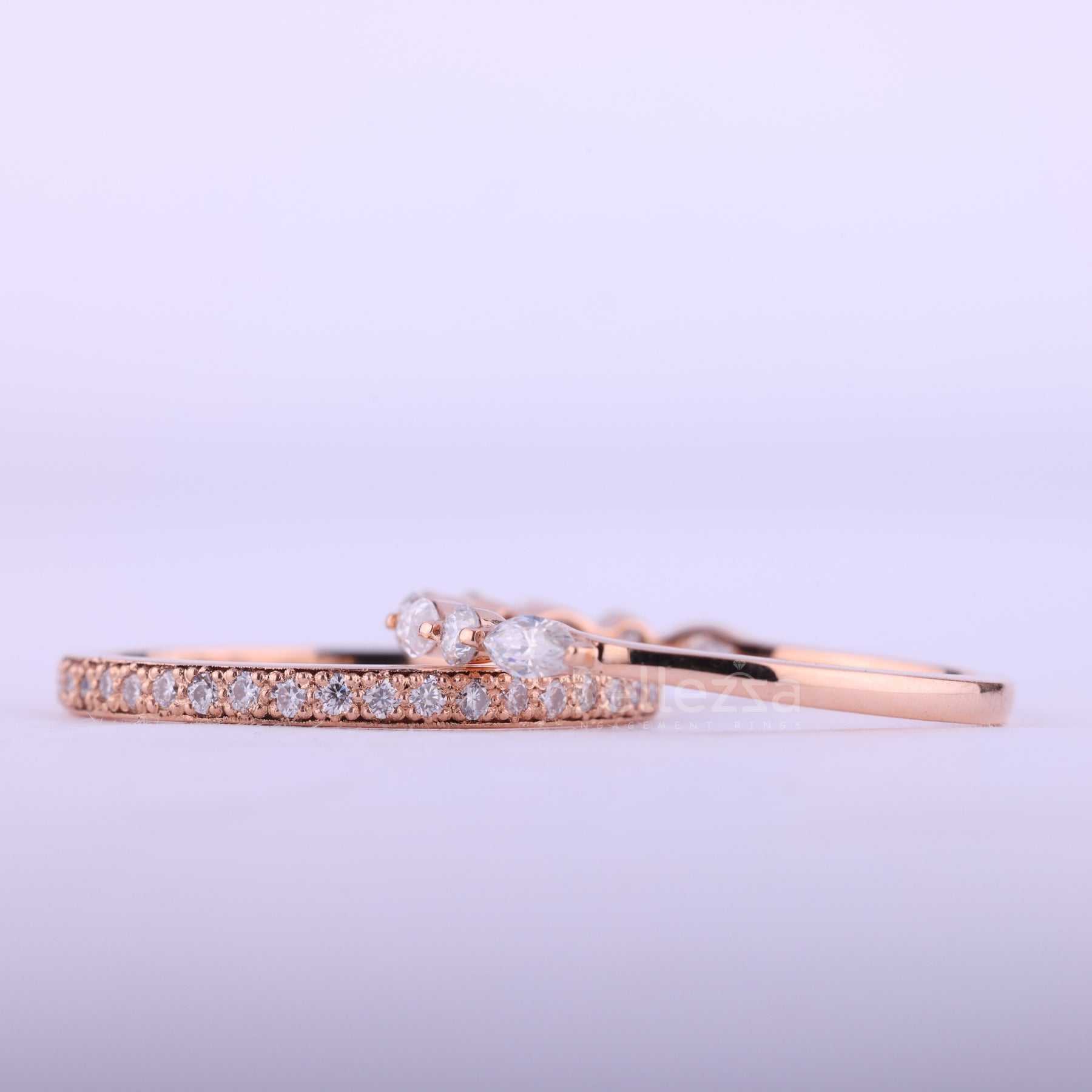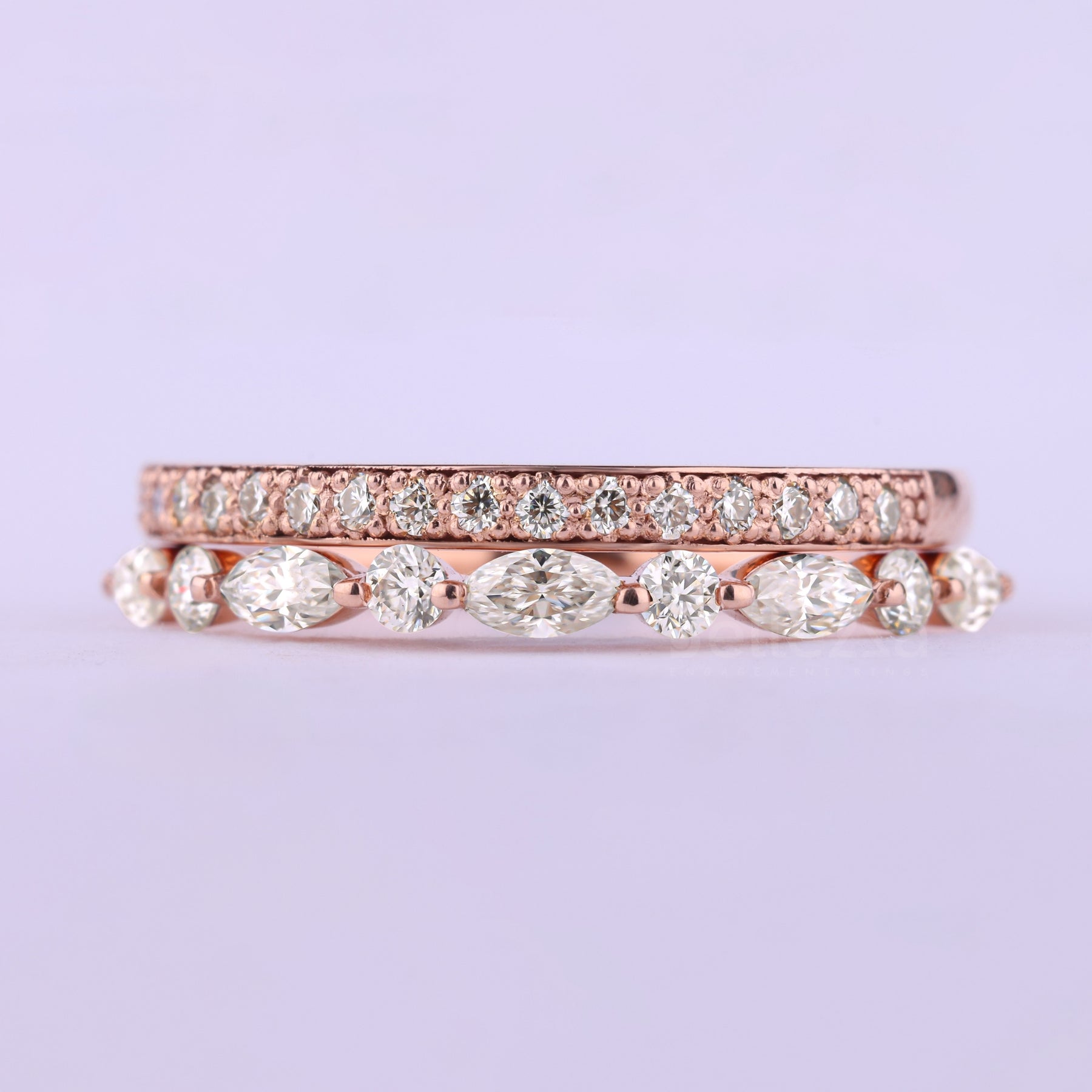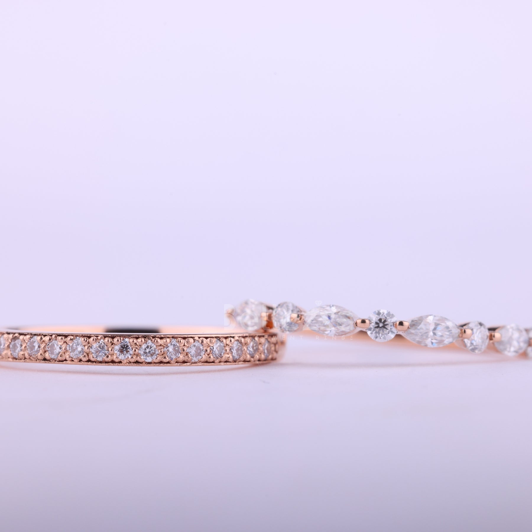 The image presents a beautifully designed set of Round & Marquise Cut Half Eternity moissanite wedding bands, created to offer elegance with a modern edge. Alternating Round Cut and Marquise Cut moissanites form a graceful pattern, delivering brilliance and sophistication across the top half of each band. The Half Eternity design ensures comfort for daily wear while maintaining luxurious sparkle. This Two Moissanite Wedding Bands set is perfect for stacking, pairing with an engagement ring, or wearing separately for a versatile bridal look. Crafted for her, it combines timeless charm with today’s trending style. A radiant symbol of love and individuality.