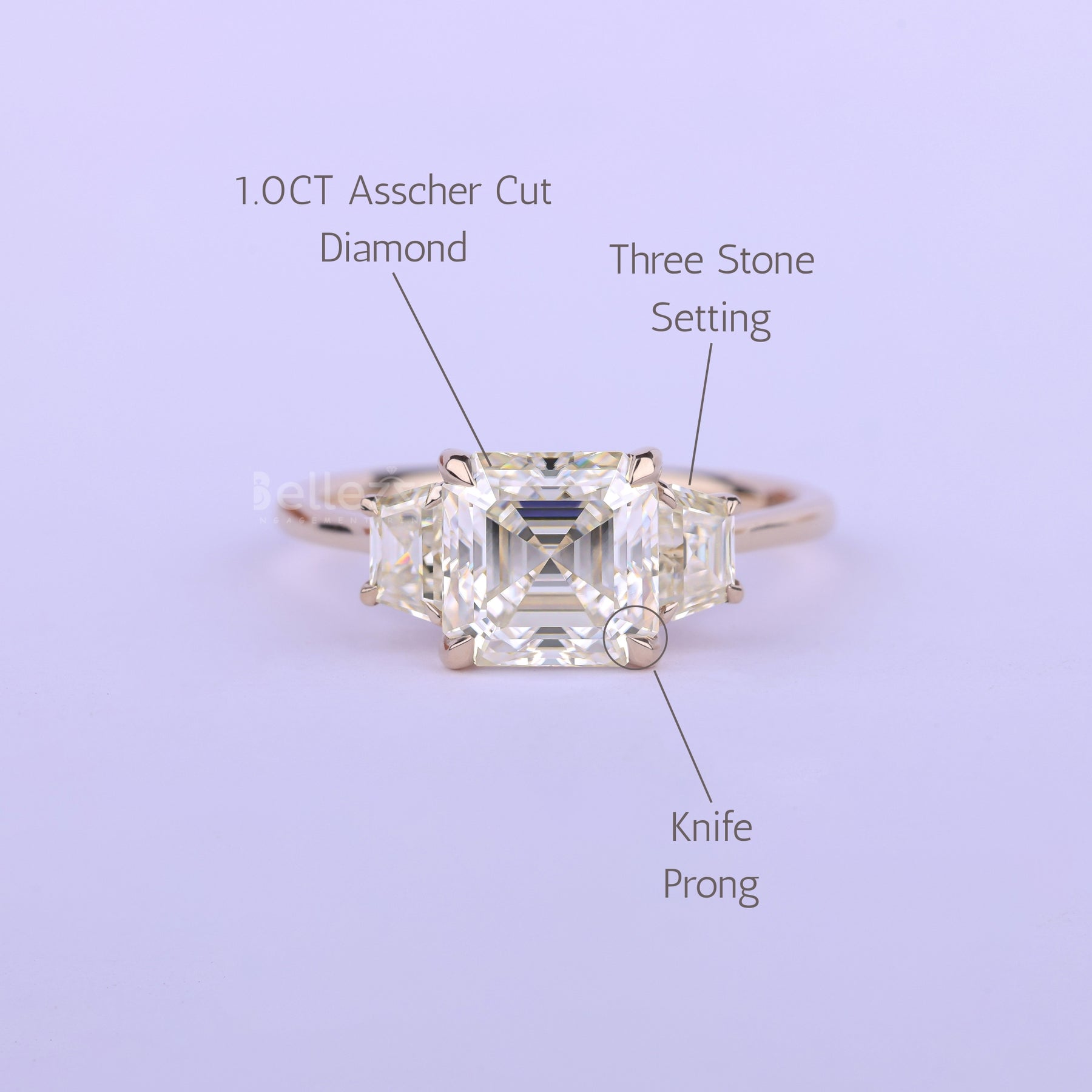1.0CT Asscher Cut Diamond Three Stone Moissanite Engagement Ring