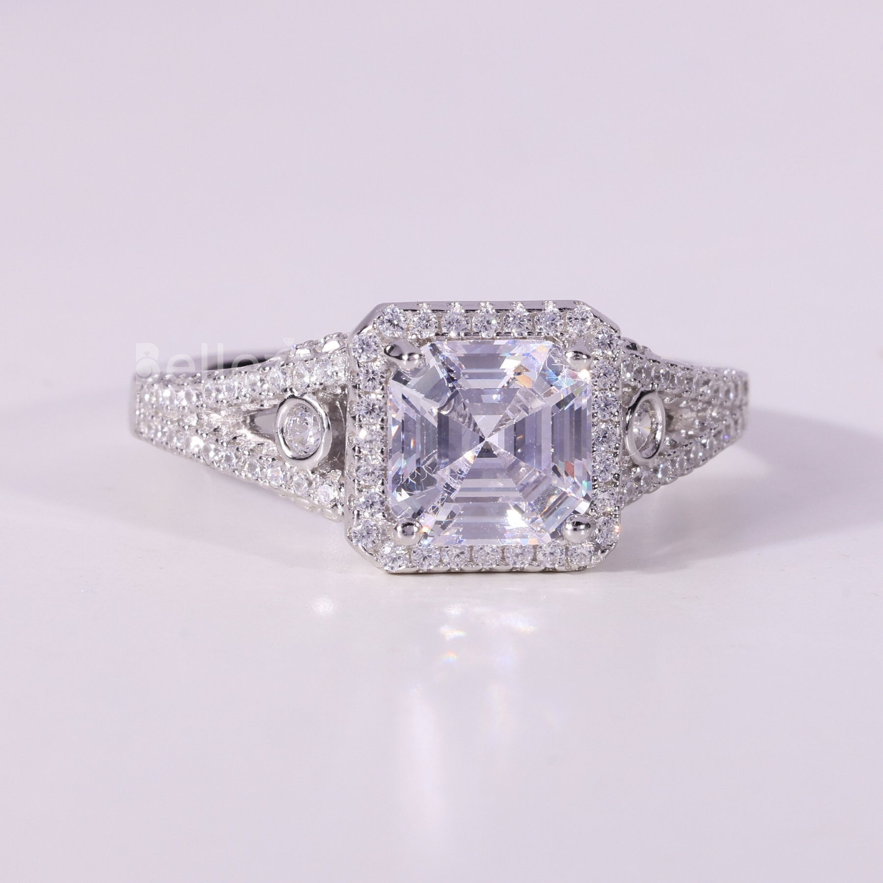 1.0CT Asscher Cut Diamond Halo Cluster Setting Moissanite Engagement Ring