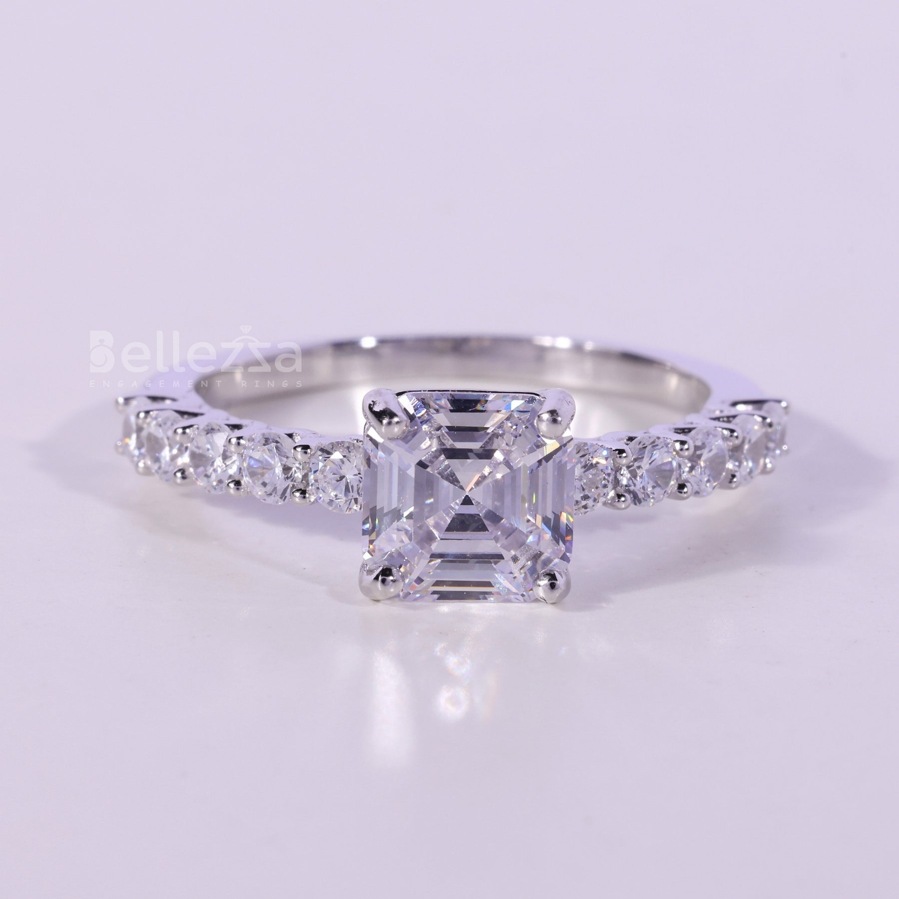✥The image highlights our stunning 1.0CT Asscher Cut Pave Setting Moissanite Engagement Ring, a masterpiece of elegance and sparkle. Featuring a brilliant asscher cut moissanite center stone, its unique faceting maximizes fire and clarity. The delicate pave setting enhances the ring’s brilliance, creating a luxurious yet timeless design. Perfect for modern brides seeking a moissanite engagement ring that blends sophistication with affordability. This elegant piece offers the brilliance of diamonds with the eco-friendly beauty of moissanite, making it an ideal choice for a truly unique engagement ring.