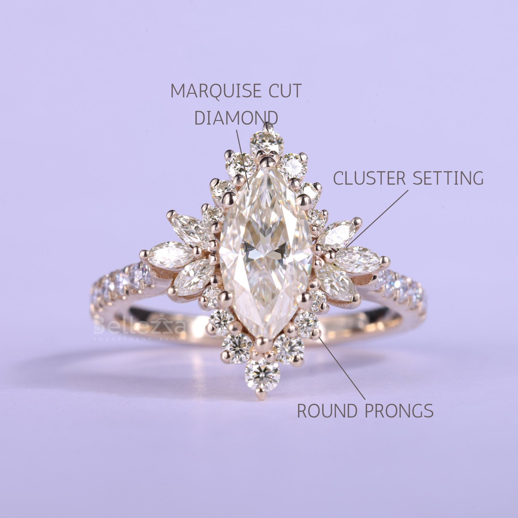 ✥The image features a stunning 1.0CT Marquise Cut Cluster Diamond Engagement Ring, crafted to dazzle with elegance and brilliance. The elongated Marquise Cut moissanite takes center stage, beautifully surrounded by a radiant Cluster Diamond halo that enhances its sparkle. Designed to make a statement, this Engagement Ring blends vintage charm with modern sophistication. The 1.0CT center stone offers maximum shine and finger coverage, creating a luxurious feel. With its timeless silhouette and shimmering Diamond Moissanite, it's a perfect choice for unforgettable proposals and everlasting love.