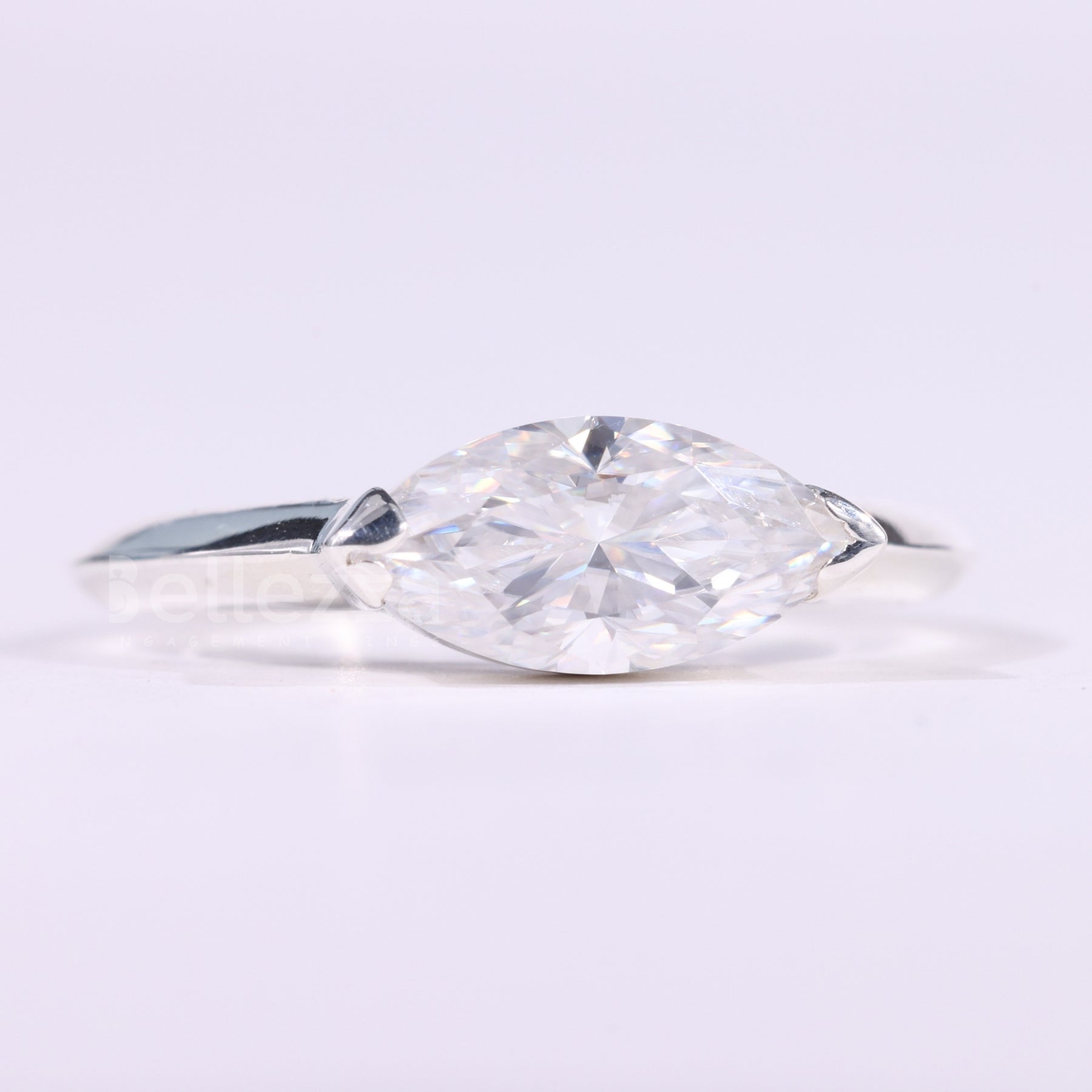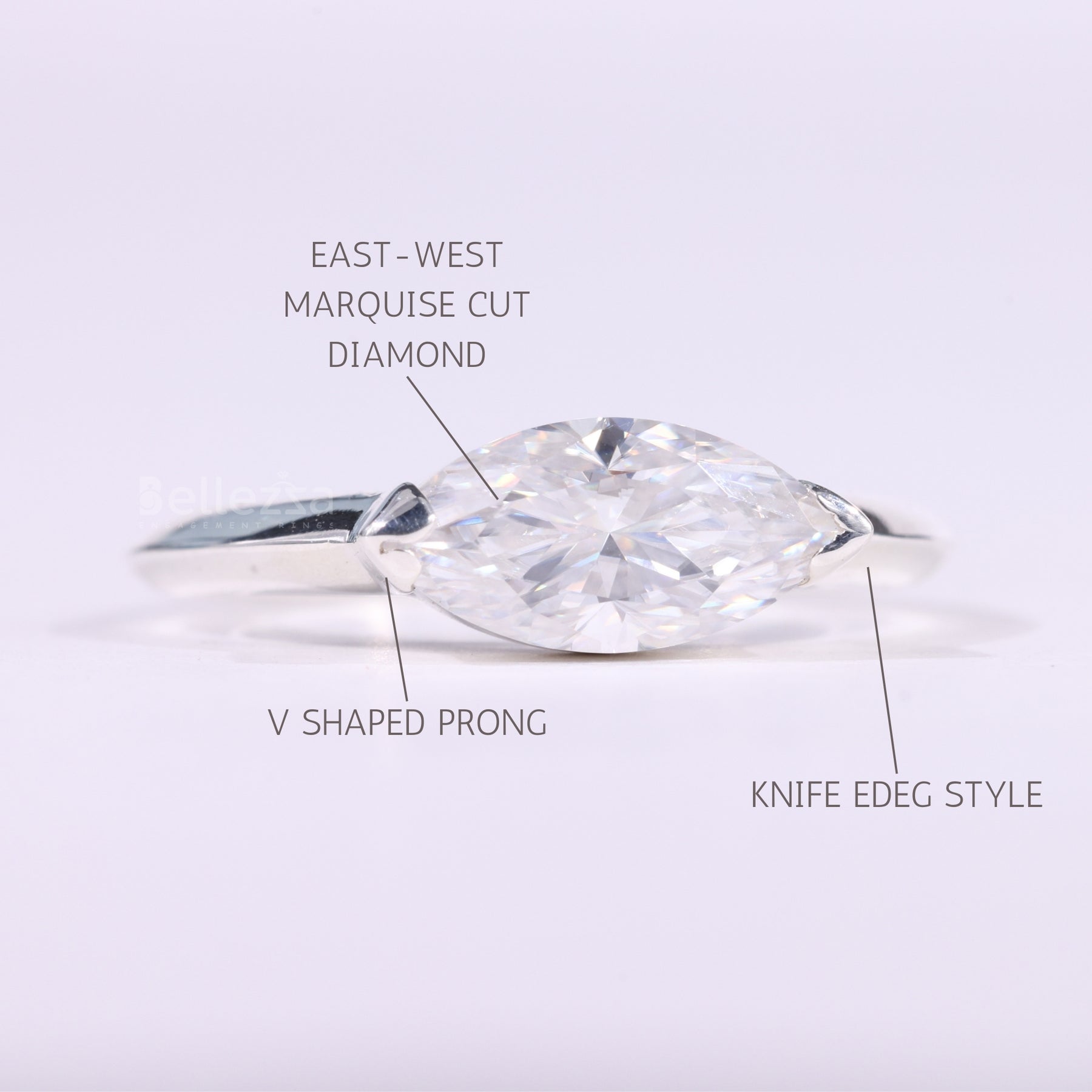 ✥This elegant image showcases the 1.50CT East-West Marquise Cut Solitaire Engagement Ring, a modern twist on a timeless classic. The east-west marquise cut center stone is set horizontally, creating a unique and contemporary silhouette while enhancing finger length. Designed as a solitaire, it draws all attention to the moissanite’s exceptional sparkle and brilliance. Crafted with premium quality, this engagement ring offers a refined balance of bold style and everyday elegance. Its 1.50-carat size delivers a striking yet graceful presence, perfect for making a statement. Celebrate your love with this trending, sophisticated ring that blends tradition with modern flair.