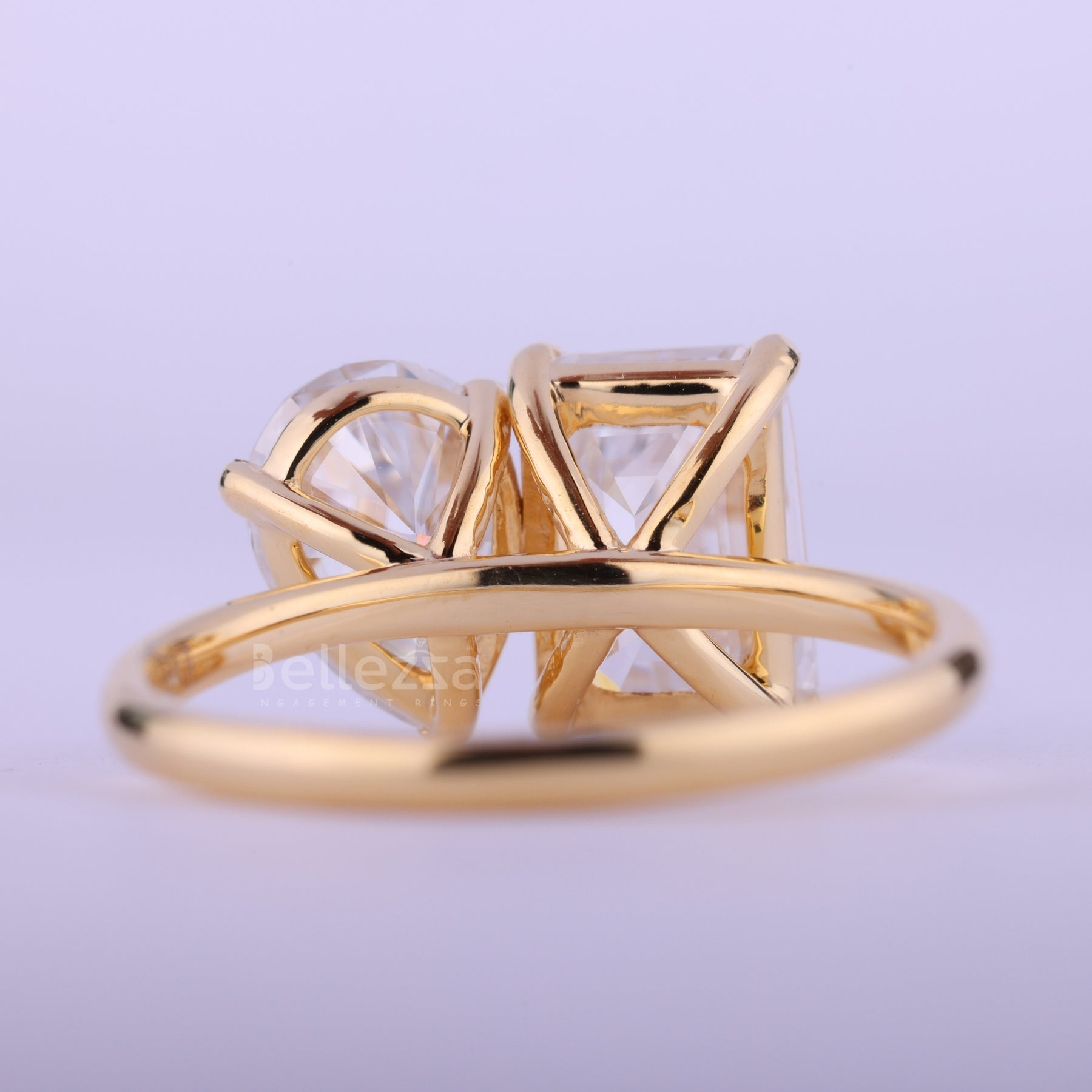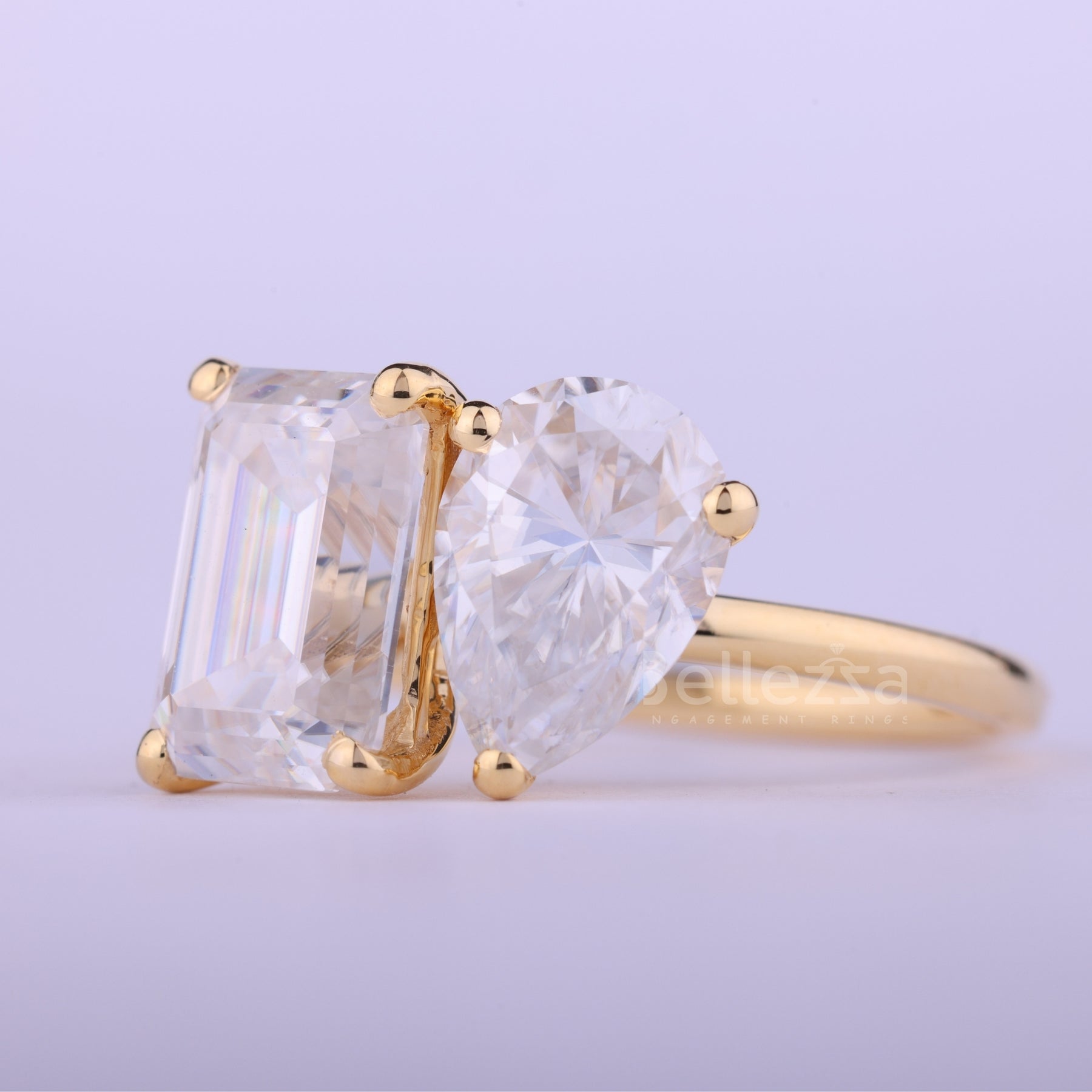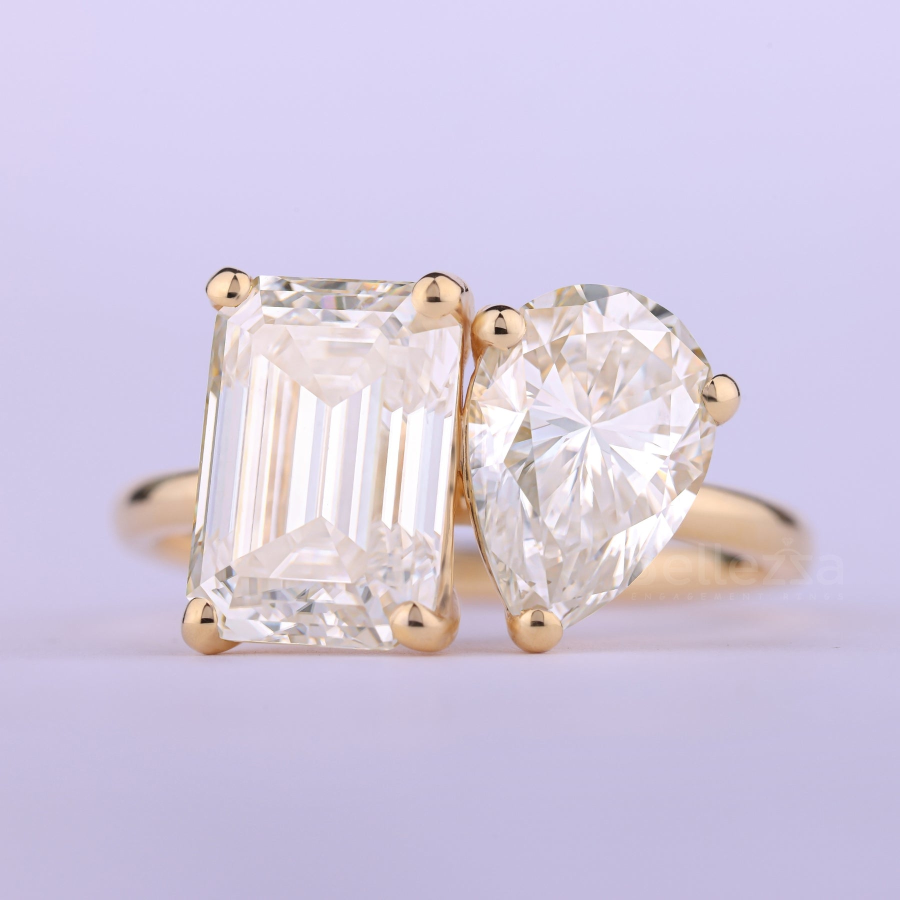 ✥The image showcases a breathtaking 2.0CT Emerald & Pear Cut Diamond Toi Et Moi Engagement Ring, symbolizing the union of two souls through its iconic dual-stone design. Featuring a sleek, step-cut Emerald Cut diamond paired with a brilliant Pear Cut stone, this Toi Et Moi setting creates a perfect balance of structure and sparkle. The contrasting shapes bring harmony and elegance, making it a standout piece in modern bridal trends. Crafted with precision and love, this Diamond Engagement Ring blends timeless charm with unique expression. A romantic and meaningful choice for a truly unforgettable proposal.
