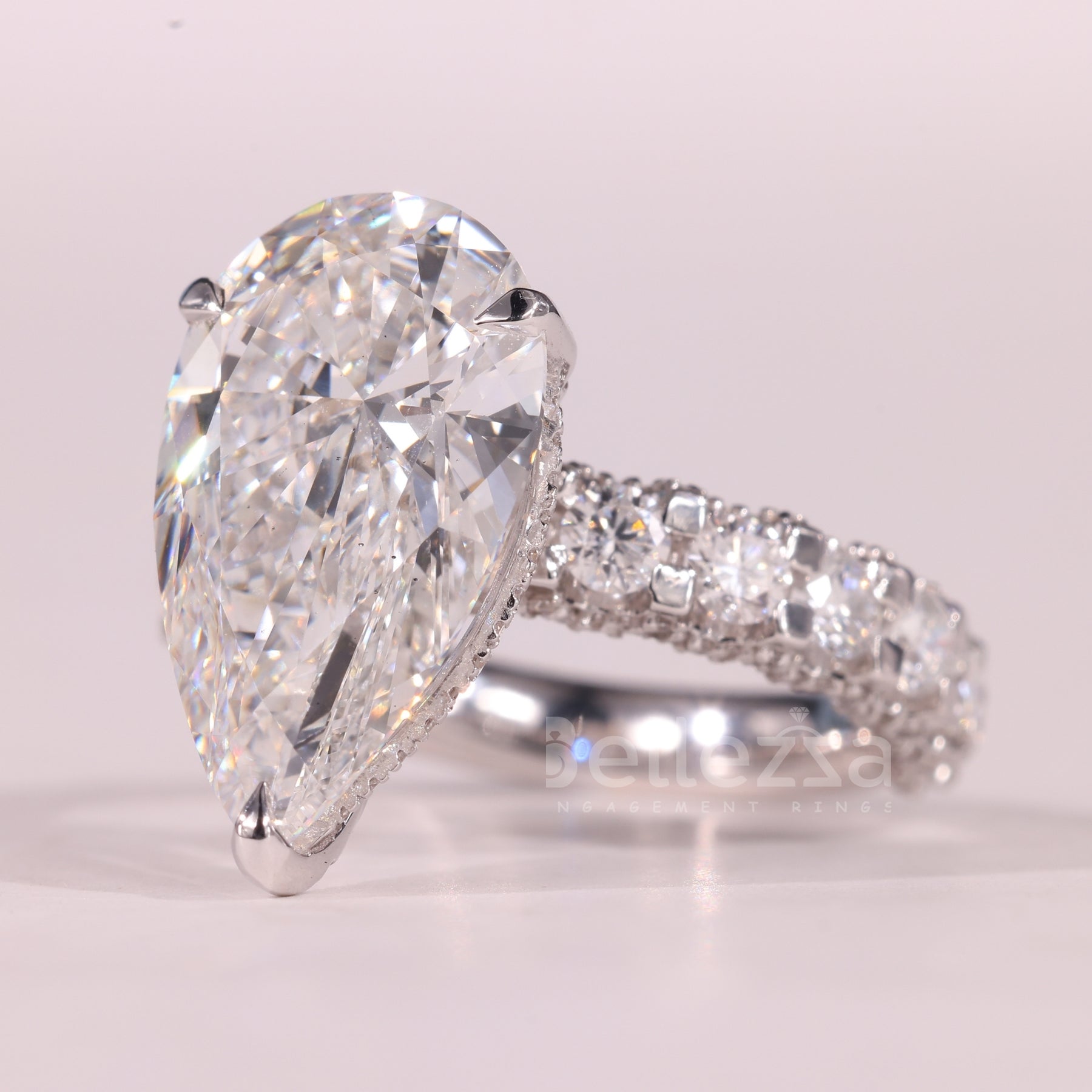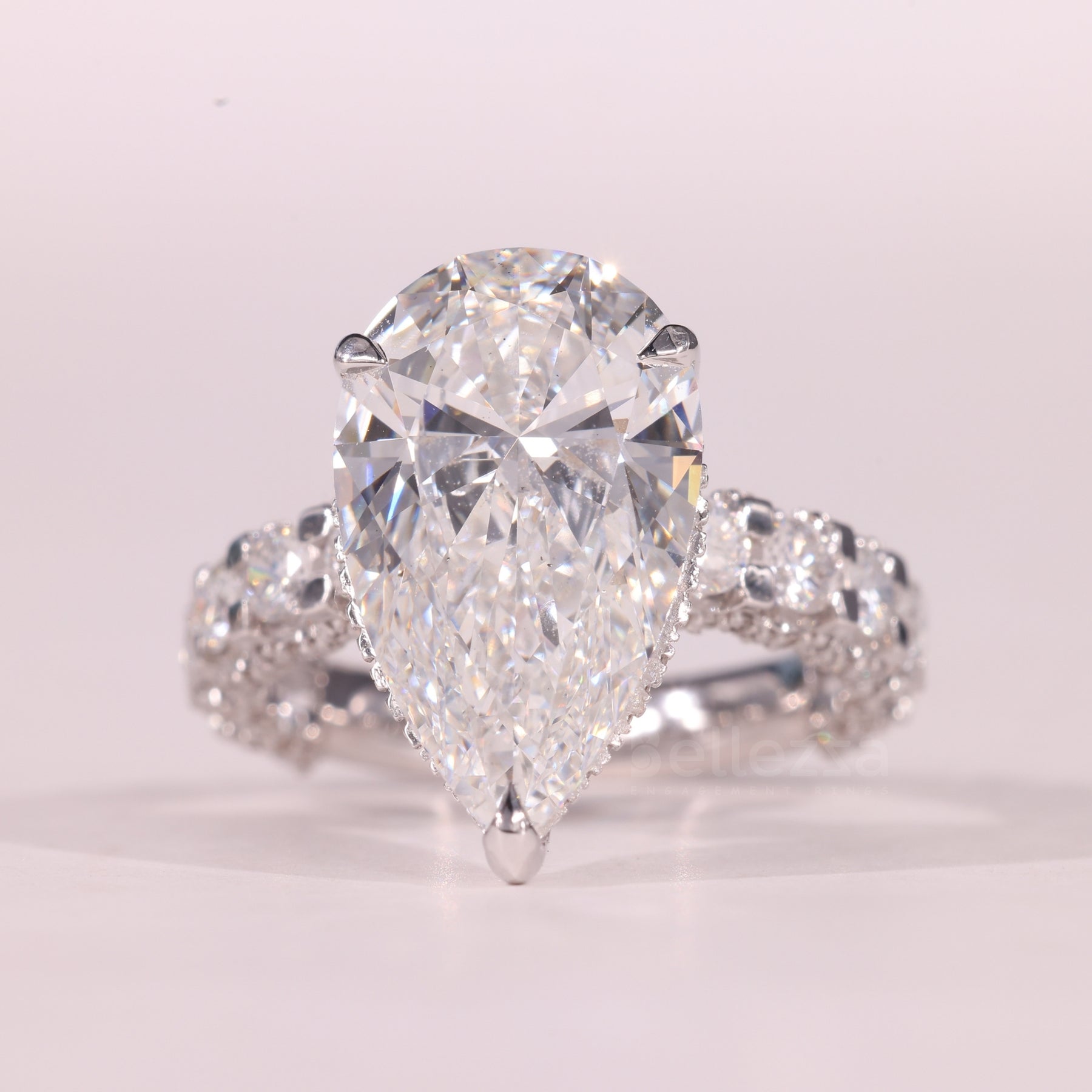 ✥The image features a stunning 4.50CT Pear Cut Diamond moissanite engagement ring, crafted for brides who seek bold sparkle with refined detail. The elegant Pear Cut center stone offers a timeless teardrop silhouette, elevated by a shimmering Pave Setting along the band. A delicate Hidden Halo lies beneath the center stone, adding surprise brilliance and depth without overwhelming the design. This luxurious Engagement Ring captures both drama and sophistication, making it perfect for unforgettable proposals. Rising in demand for its mix of glamour and elegance, this Diamond Moissanite Ring is a radiant symbol of lasting love.