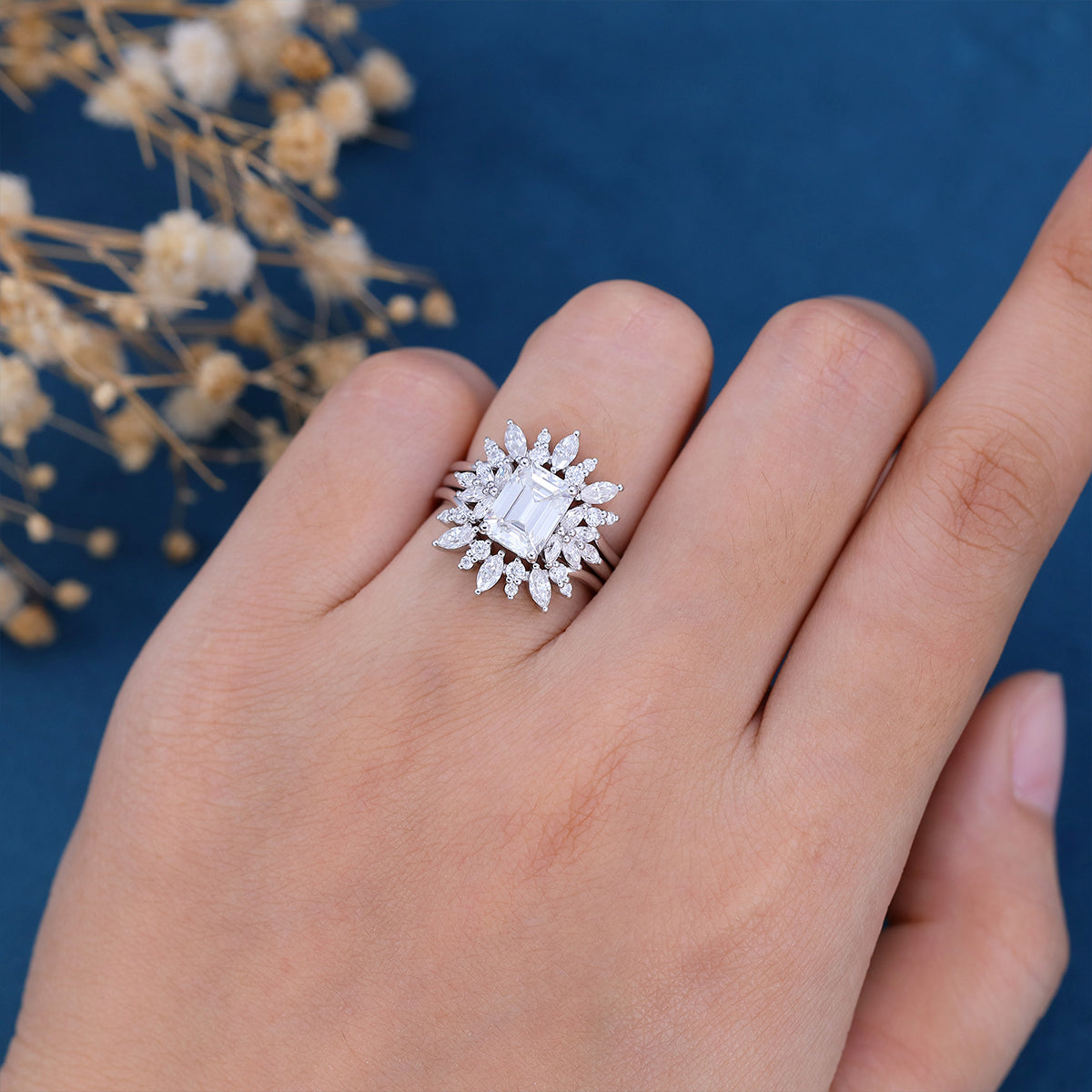 1.60 CT Emerald Shaped Moissanite Cluster Bridal Set