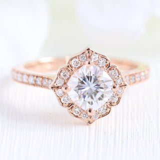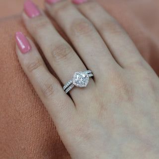 ✥ Indulge in the romantic elegance of our Cushion Cut Moissanite Bridal Ring Set, expertly crafted in lustrous 14k rose gold. This exquisite set combines a 1.5ct cushion-cut Moissanite engagement ring with a matching wedding band, creating a seamless and timeless symbol of your love. The center stone is a brilliant, ethically sourced Moissanite, renowned for its fire and brilliance, set in a classic prong setting. The delicate and scalloped design of the engagement ring is beautifully complemented by the contour wedding band, creating a harmonious and luxurious pairing. This set not only represents your love but also embodies your distinctive style, promising a future as precious as the bond it signifies.