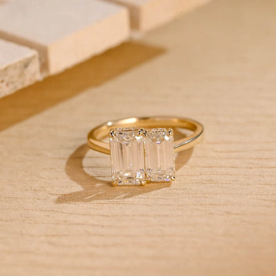 1.50 CT Elongated Emerald Cut Two Stone Hidden Halo Moissanite Engagement Ring