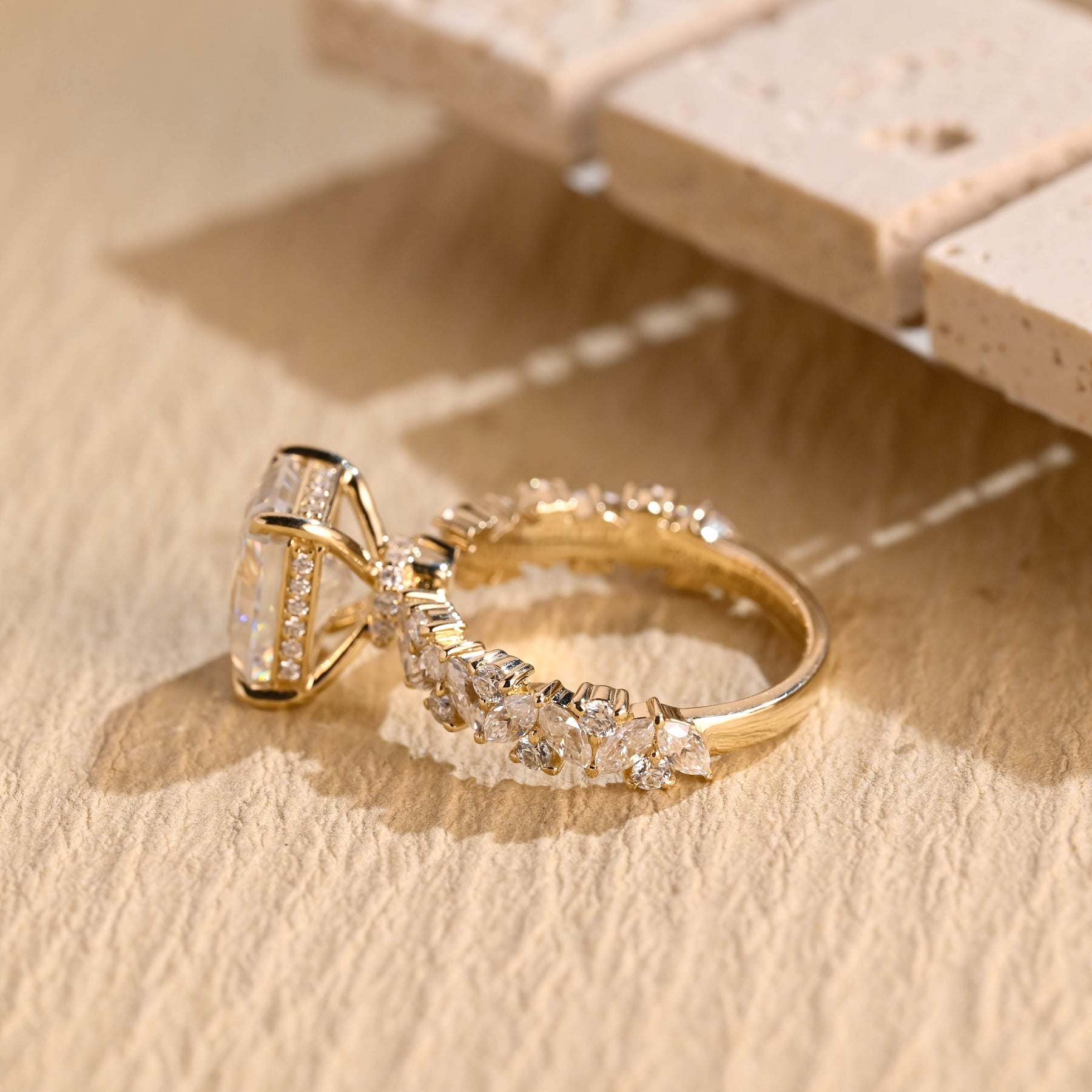✥The 1.50 CT radiant-cut hidden-halo cluster Moissanite Engagement Ring features a stunning 1.50 CT radiant-cut moissanite at its center, surrounded by a hidden halo of smaller diamonds or moissanite. The cluster of stones beneath the center stone adds an extra layer of sparkle and brilliance, creating a captivating effect. The hidden halo is cleverly tucked beneath the main stone, giving it a unique and elegant touch. This design combines classic beauty with a modern twist, making it a perfect symbol of love and commitment.