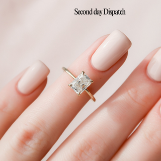 This elegant engagement ring features a 1.50CT radiant cut moissanite, exuding brilliance and sophistication. A hidden halo of smaller stones enhances the sparkle, giving the ring a unique and modern touch. Set in 14K yellow gold, it offers a classic and timeless look that complements the radiant centerpiece. Available in size 6.50 US, this ring is ready to ship with next-day dispatch for a quick and seamless delivery.