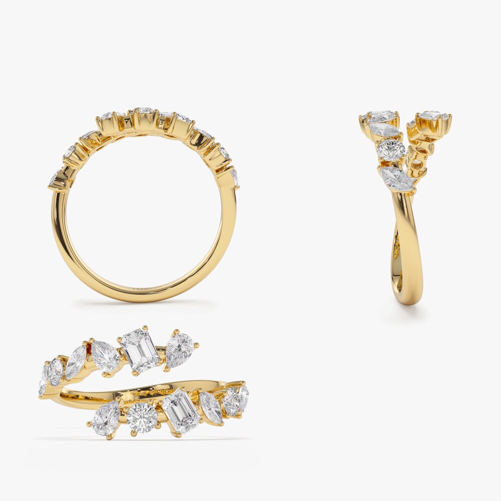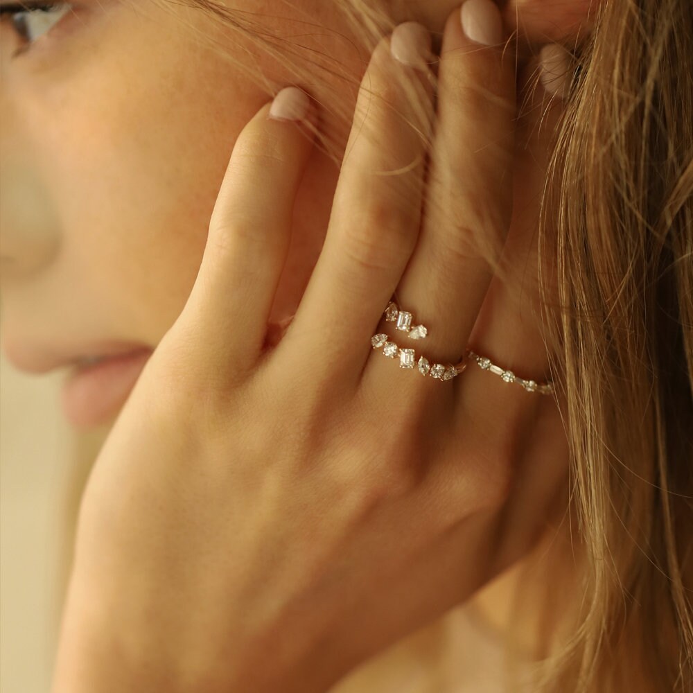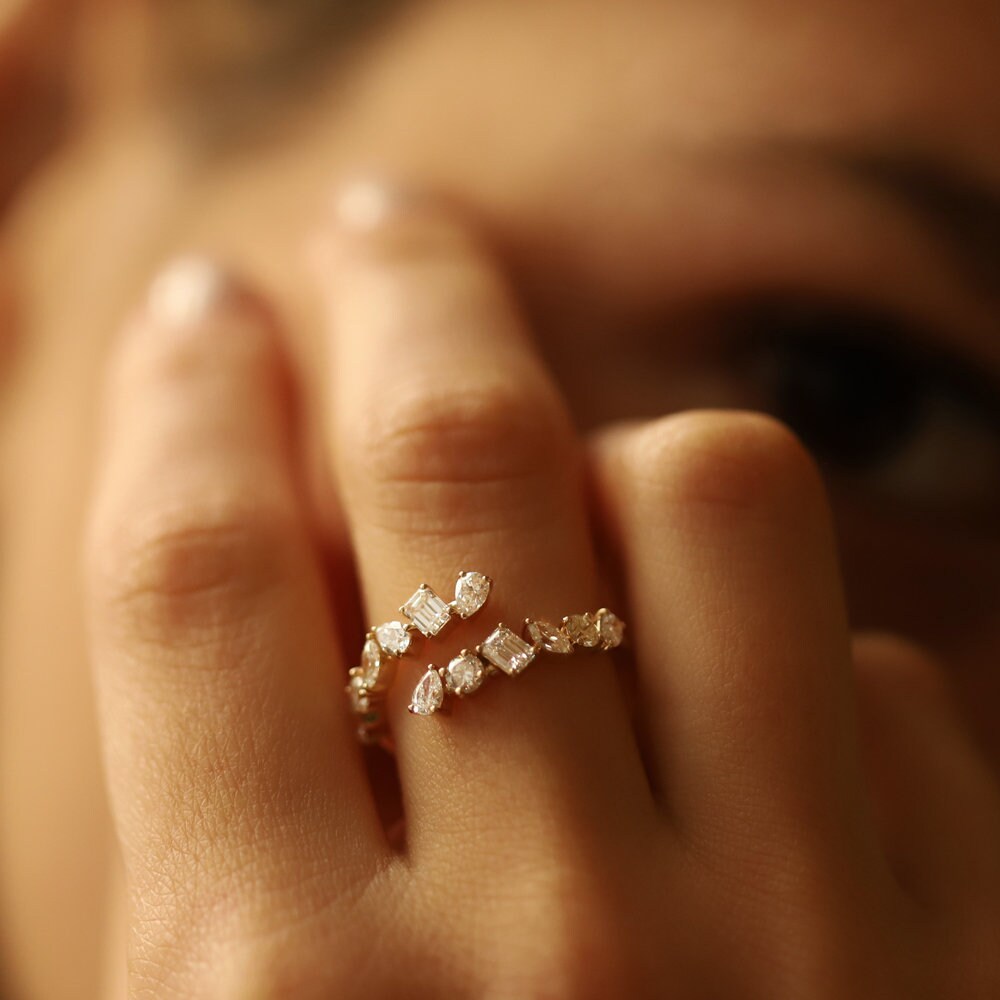 ✥ The stunning 14k Solid Gold Cross Over Mix Diamond Statement Ring for Her skillfully combines cutting-edge style with classic grace. With a striking cross-over design and a variety of shimmering diamonds that catch the light from every angle, this gorgeous ring makes a stunning display. It's the ideal choice for those special moments because it goes well with Christmas proposal engagement rings and wedding bands. It's perfect as a Christmas proposal ring. Because of its uncommon design, it's also a great choice for dark romance engagement rings or Halloween proposal rings, appealing to people who enjoy wearing unusual jewelry. Presented as a classy present or included in a Halloween jewelry set.