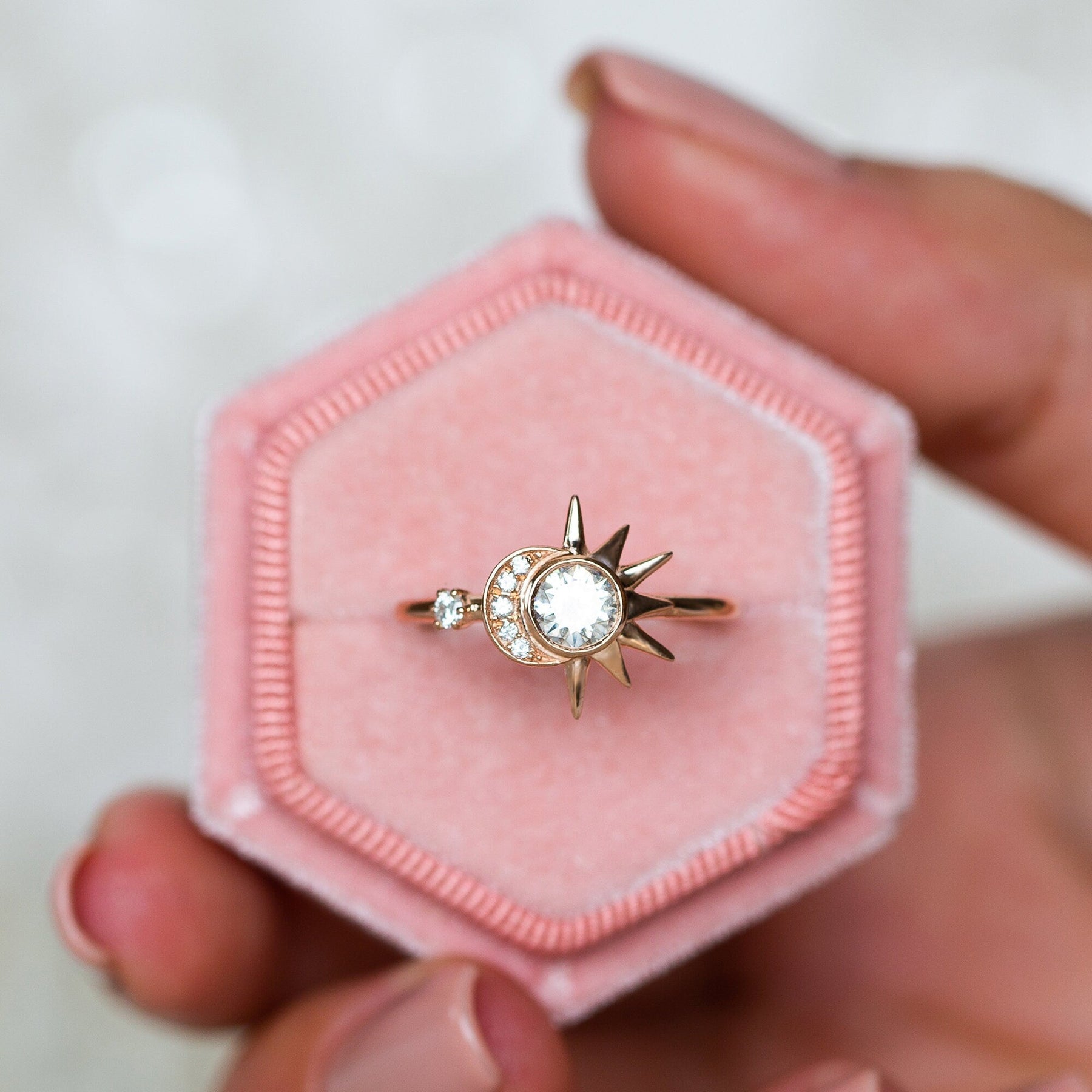 Round Moissanite Diamond Sun & Crescent Moon Engagement Ring In Solid Gold