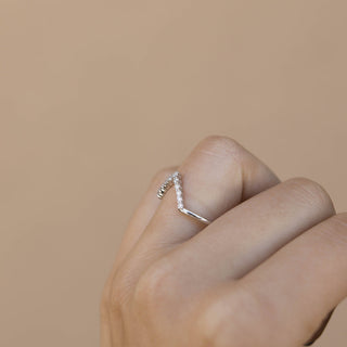 ✦ Enhance your love story with our captivating 0.20ct Round Cut Moissanite Diamond Chevron Wedding Band. Crafted with precision, each round-cut Moissanite diamond is set in a chic chevron pattern, symbolizing the unity and harmony of your partnership. The delicate design of this band adds a touch of elegance and sophistication to any ensemble, making it perfect for both everyday wear and special occasions. Ethically sourced Moissanite stones offer a sustainable and eco-friendly alternative to traditional diamonds, ensuring both beauty and conscience align. Whether worn as a wedding band or as a stylish accessory, this exquisite ring is sure to be cherished as a symbol of your enduring love and commitment.
