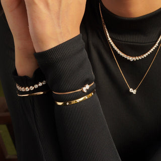 ✥ Illuminate her wrist with the enchanting beauty of our 1.0ct Round & Pear Cut Two Stone Moissanite Diamond Bracelet for Women. Meticulously crafted, this bracelet features a captivating combination of round and pear-cut Moissanite diamonds, exuding elegance and sophistication. Each diamond is expertly set to maximize its brilliance and sparkle, creating a mesmerizing display of luxury. Set in a classic bracelet design, the two-stone arrangement adds a touch of uniqueness and symbolism to the piece. Whether worn as a standalone statement or paired with other bracelets for a layered look, this bracelet is sure to turn heads and elevate any ensemble. Perfect for both formal occasions and everyday wear, it's a versatile addition to any jewelry collection. Whether gifted to a loved one or as a cherished indulgence for oneself, this exquisite bracelet is destined to be treasured for its timeless beauty and allure.