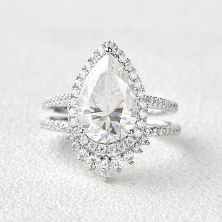 3.44CT Pear Cut Moissanite Halo Engagement Ring with Curved Stacking Band