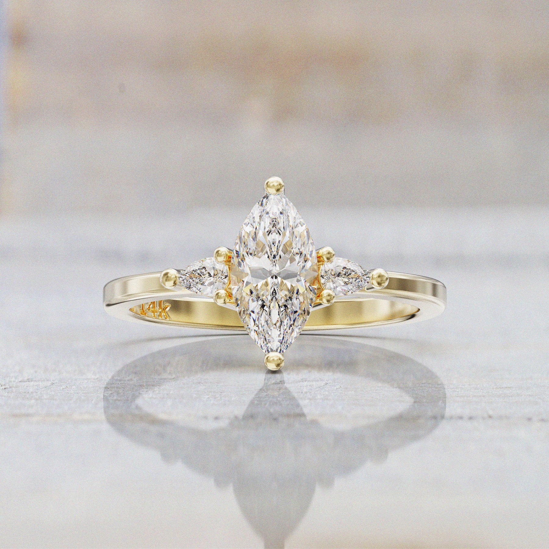 ✥ Celebrate your unique love with the 0.7 CT Marquise Cut Moissanite Three Stone Engagement Ring. Featuring a stunning marquise-cut moissanite as the central gem, flanked by two additional marquise-cut stones, this design creates a striking and elegant look. The marquise cuts' elongated shape enhances the ring's brilliance and drama, while the trio of stones symbolizes a past, present, and future together. Set in a sleek band, this engagement ring beautifully blends classic sophistication with modern flair, making it a perfect symbol of a love that is both radiant and enduring.