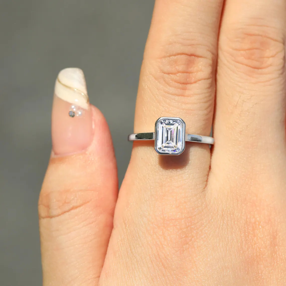 2.0CT Emerald Daimond Bezel Set Solitaire Moissanite Engagement Ring