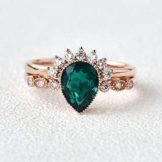 1.93ct Pear Emerald Migraine Vintage Signature Bridal Ring Set For Her