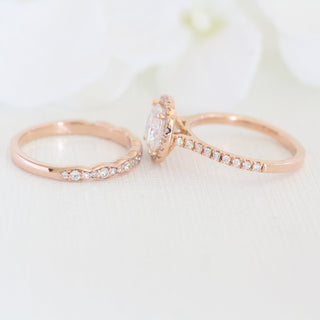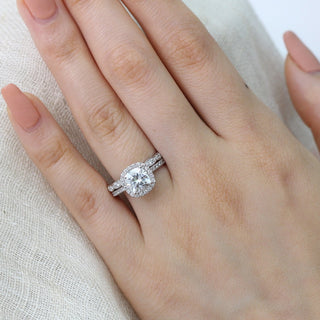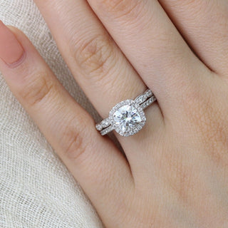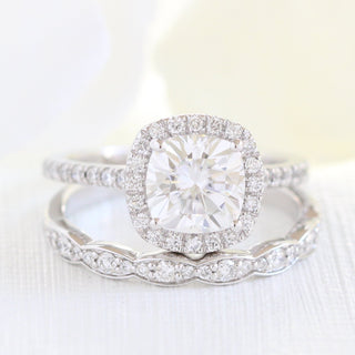 ✥ Elevate your love story to new heights with our exquisite Cushion Cut Halo Pave Ring with Scalloped Diamond Band, a stunning bridal ring set that epitomizes elegance and sophistication. The centerpiece of this set is a mesmerizing cushion-cut moissanite gem, renowned for its brilliance and fire, delicately encircled by a halo of sparkling moissanite accents. What sets this ring apart is its intricate scalloped diamond band, meticulously crafted to add a touch of vintage charm and timeless allure to your engagement or wedding day. Available in a range of precious metals, this bridal set is a symbol of your commitment and enduring love. With its graceful design and exceptional craftsmanship, it promises to be a cherished heirloom for generations to come. Declare your love with the Cushion Cut Halo Pave Ring with Scalloped Diamond Band, a masterpiece that will forever symbolize your journey together.