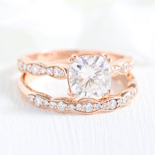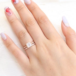 ✥ Elevate your love story with our exquisite Cushion Cut Moissanite Ring with Halo Diamond Band, a stunning bridal ring set that radiates timeless beauty and elegance. The centerpiece of this set is a brilliant cushion-cut moissanite, known for its exceptional sparkle and fire. Encircling the moissanite is a delicate halo of shimmering round-cut diamonds, adding an extra layer of brilliance and sophistication. The beauty of this ring is complemented by its matching wedding band, which features a row of glistening diamonds that perfectly align with the engagement ring, creating a seamless and captivating ensemble. Crafted with meticulous attention to detail and set in your choice of metal, this bridal ring set symbolizes your enduring love and commitment. Its classic yet contemporary design makes it the perfect choice for the bride who appreciates both tradition and modern sophistication, a true heirloom to cherish for a lifetime.