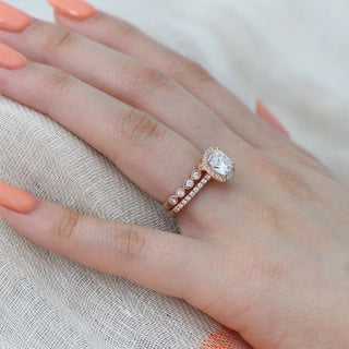 Cushion cut moissanite with halo bridal band set 14k in rose gold