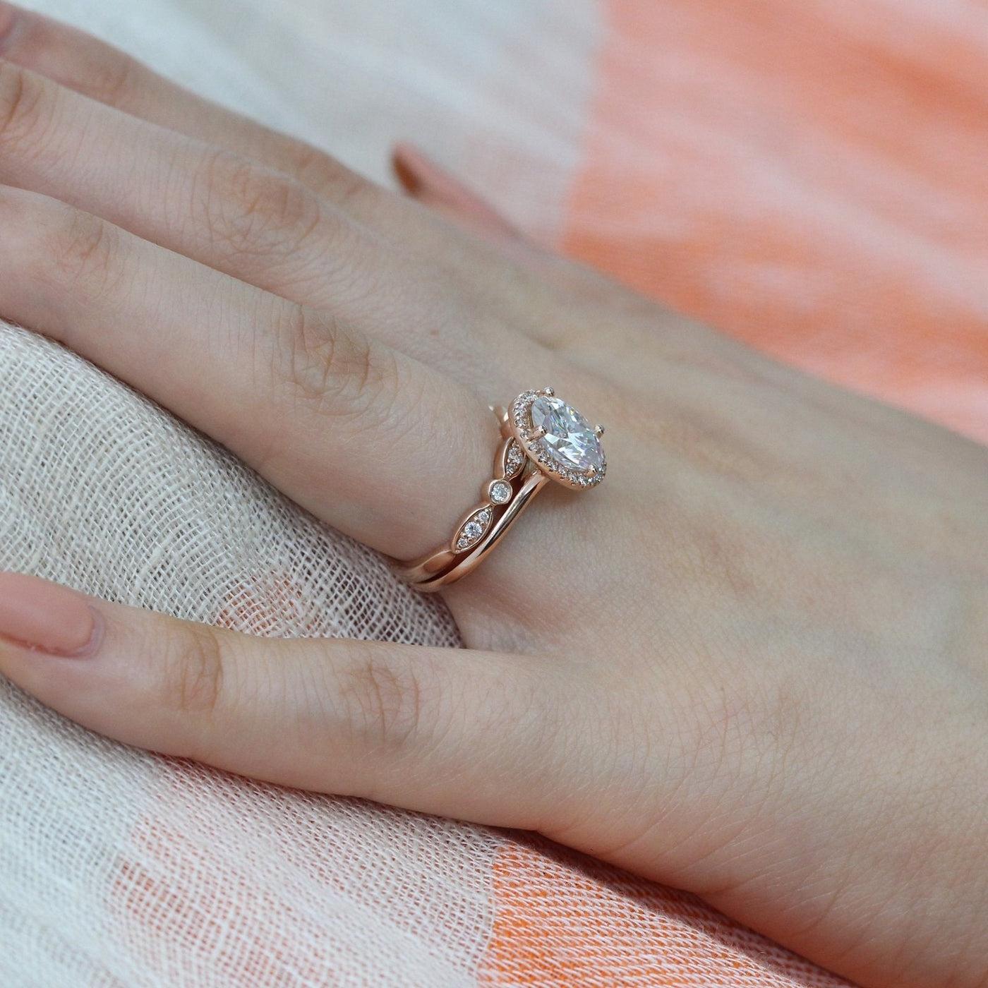 ✥ Celebrate your love story with our Oval Cut Moissanite Bridal Ring Set in stunning 14k rose gold. This exquisite set is a symbol of your eternal commitment and a testament to your unique and timeless love. The centerpiece of this set is a brilliant oval-cut moissanite gemstone that radiates with fire and brilliance, capturing the essence of your love's eternal flame. The moissanite is cradled within a halo of smaller moissanite stones, adding an extra layer of sparkle and sophistication to the engagement ring. The matching wedding band is elegantly designed to complement the engagement ring, creating a harmonious and cohesive look. The warm and romantic tones of the 14k rose gold band enhance the overall beauty of the set, giving it a touch of vintage charm. This bridal ring set is not just a piece of jewelry; it's a reflection of your unique love story and a promise of a future filled with happiness and togetherness. It's the perfect choice to symbolize your love and commitment as you embark on this incredible journey together.