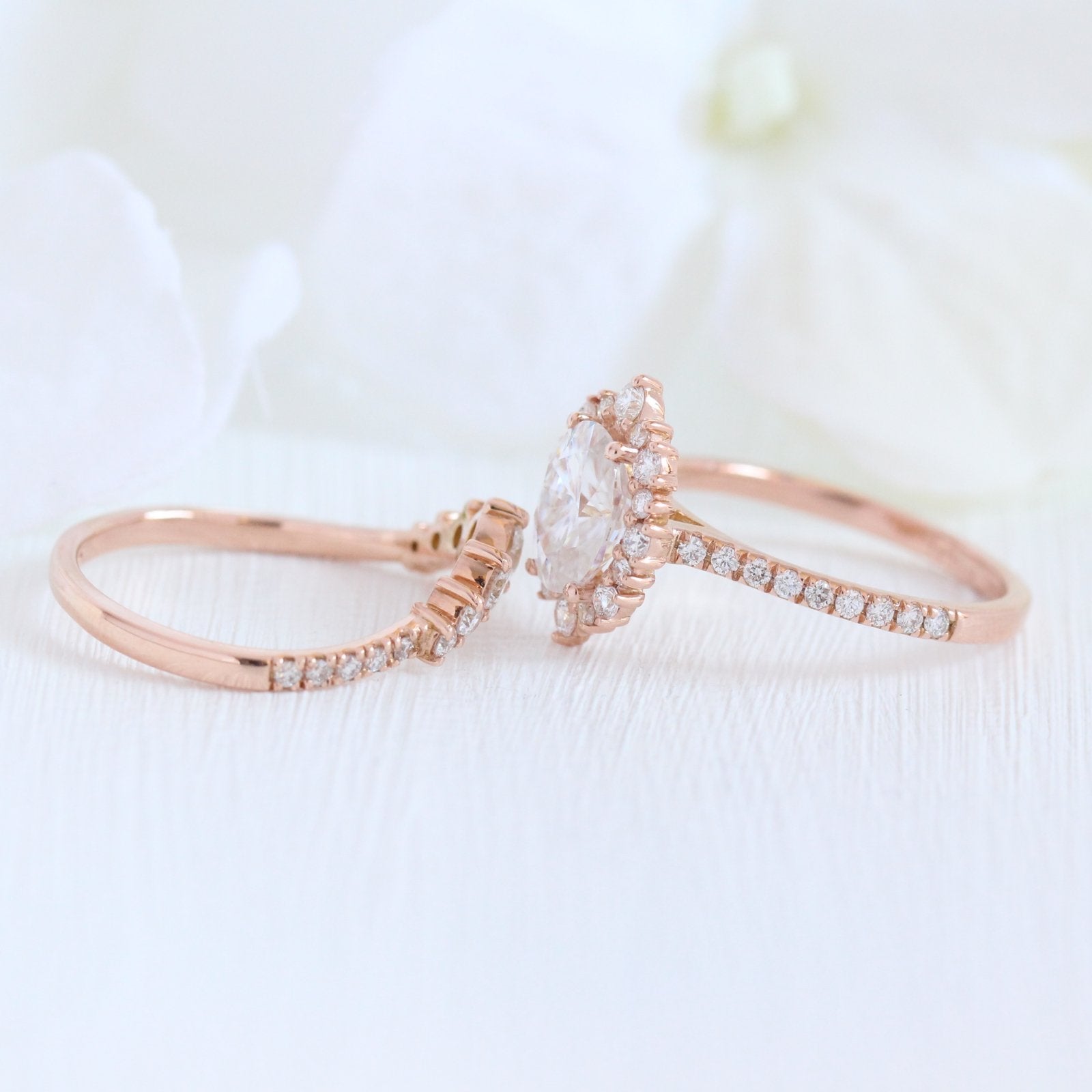 Oval cut moissanite with halo bridal band set 14k in rose gold