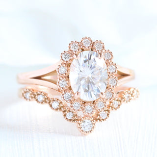 Oval cut moissanite with halo bridal band set 14k in rose gold