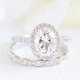 ✥ Elevate your love story with our exquisite Oval Halo Pave Moissanite Ring with Scalloped Diamond Band, a stunning Bridal Ring Set that captures the essence of timeless romance. The centerpiece of this set is a dazzling oval-cut moissanite, cradled in a halo of smaller moissanite stones, creating a brilliant and radiant focal point. The intricately designed scalloped diamond band adds a touch of sophistication, enhancing the overall allure of the ring. Meticulously crafted in your choice of precious metal, this bridal set is a harmonious blend of modern elegance and classic charm. The brilliance of moissanite, renowned for its exceptional sparkle, paired with the timeless beauty of diamonds, makes this set a symbol of enduring love and commitment. Celebrate your special moments with the Oval Halo Pave Moissanite Ring with Scalloped Diamond Band Bridal Ring Set, a masterpiece that will be cherished for a lifetime.
