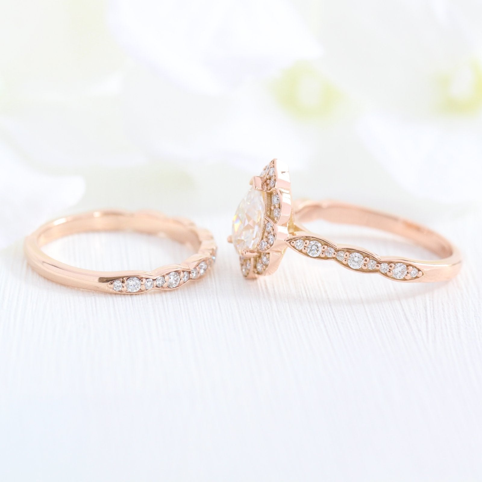 ✥ Experience the exquisite beauty of our Pear Floral Moissanite Bridal Set, elegantly crafted in 14k rose gold. This stunning set includes a 1.25ct pear-cut Moissanite engagement ring and a matching wedding band, designed to symbolize the everlasting union of your love. The center stone's pear shape exudes timeless elegance, while the floral-inspired design on the engagement ring adds a touch of romance and sophistication. The perfectly contoured wedding band enhances the set's overall charm, creating a seamless and captivating combination. Not only does this bridal set represent your love, but it also reflects your unique style, promising a future as beautiful and enduring as the love it signifies.