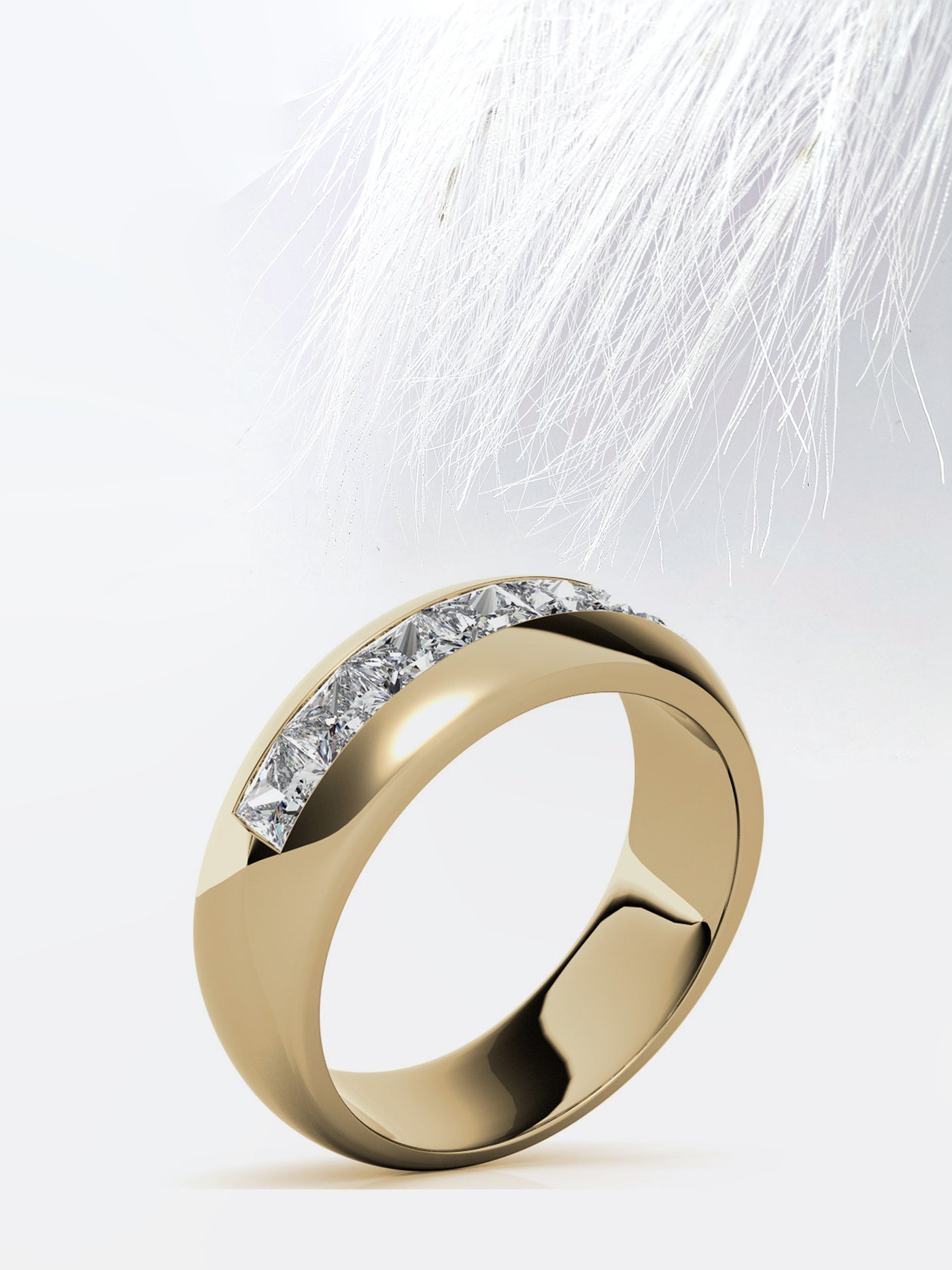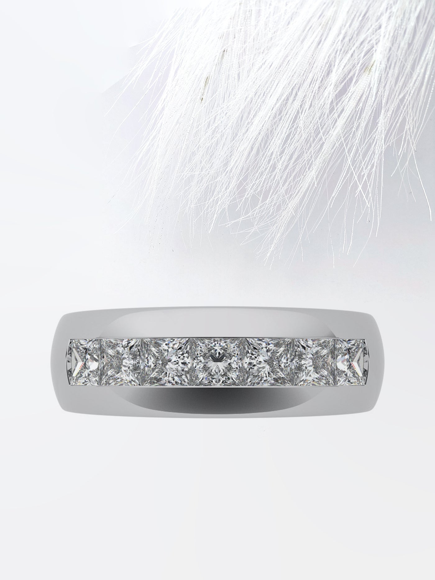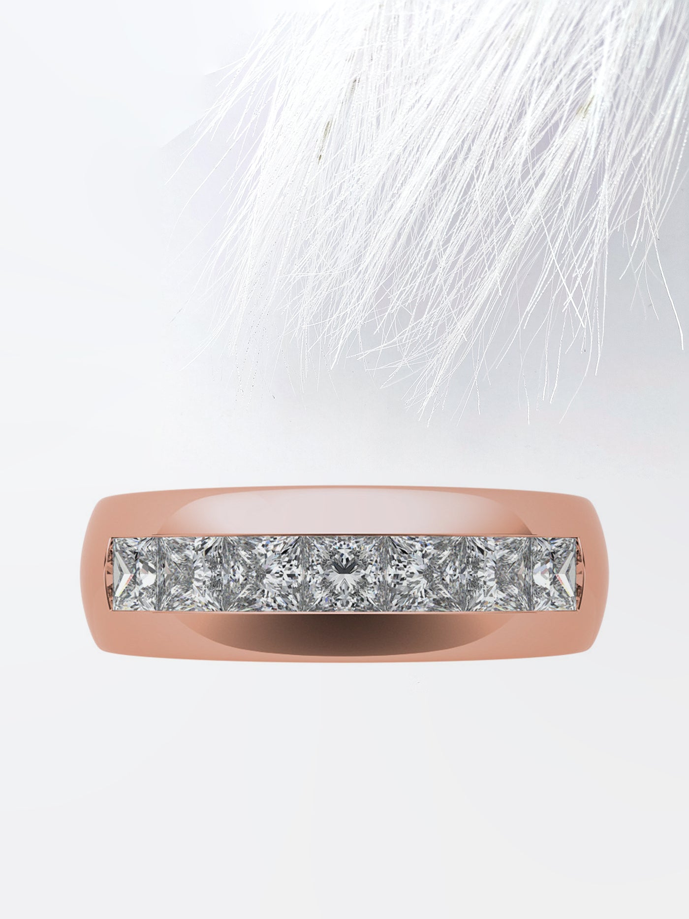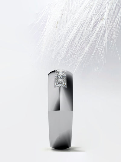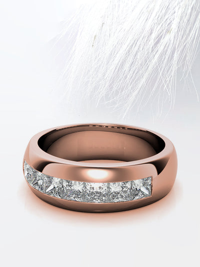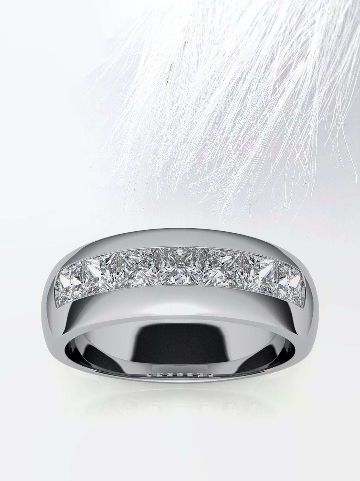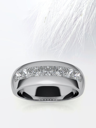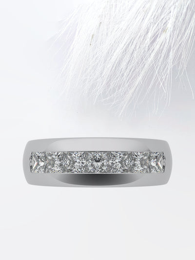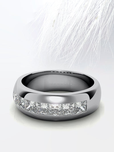 Introducing our elegant Princess Cut Channel Moissanite Men's Diamond Wedding Band, a refined symbol of everlasting love and sophistication. Crafted with precision, this exquisite wedding band features princess-cut moissanite stones set in a sleek channel setting, creating a seamless and stylish design. Each moissanite stone sparkles with brilliance, adding a touch of luxury to the band. Made with eco-friendly moissanite gemstones, this band offers exceptional quality and sustainability without compromising on style. Its classic yet modern design makes it the perfect choice for the discerning groom who seeks understated elegance on his wedding day. Celebrate your eternal commitment with this extraordinary moissanite wedding band, destined to be treasured for a lifetime of memories.