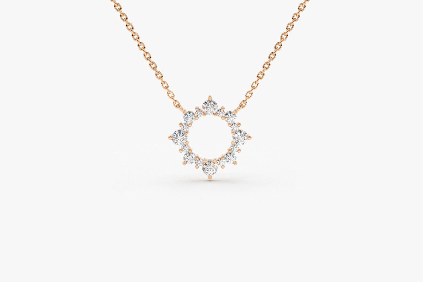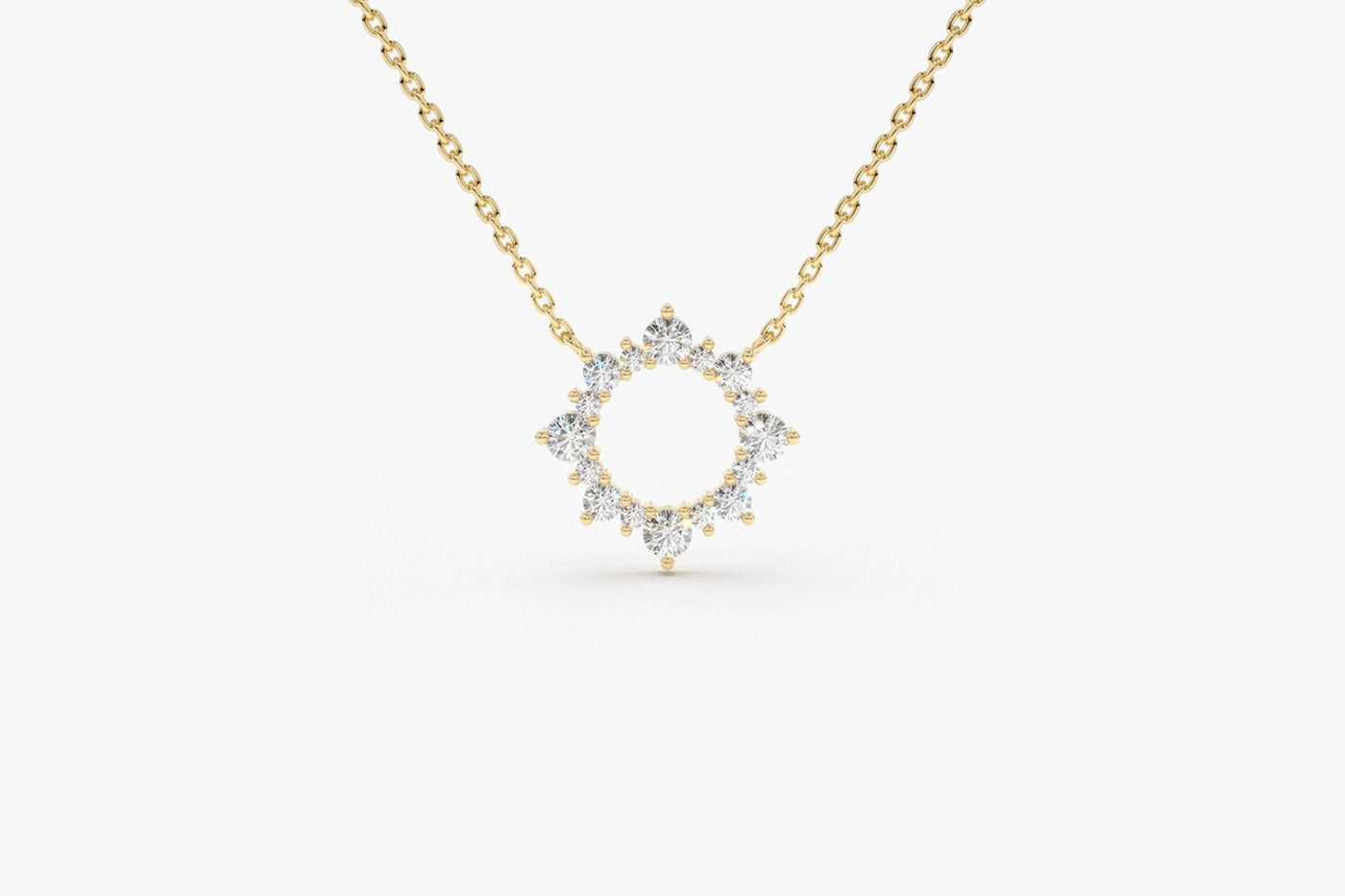 ✥ Illuminate her day with our Round Cut Diamond Sun Necklace for Women, a radiant symbol of warmth and positivity. This necklace features a sun-shaped pendant adorned with sparkling round cut diamonds, capturing the essence of brightness and energy. Crafted from premium materials for durability and lasting shine, it adds a touch of celestial charm to any outfit. Perfect for daily wear or special occasions, it's a perfect gift choice, symbolizing optimism and beauty. A cherished addition to her jewelry collection, reflecting her inner glow and elegance.