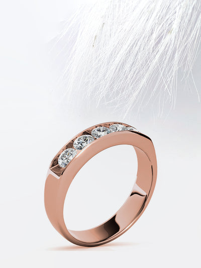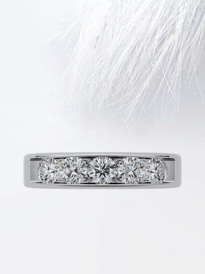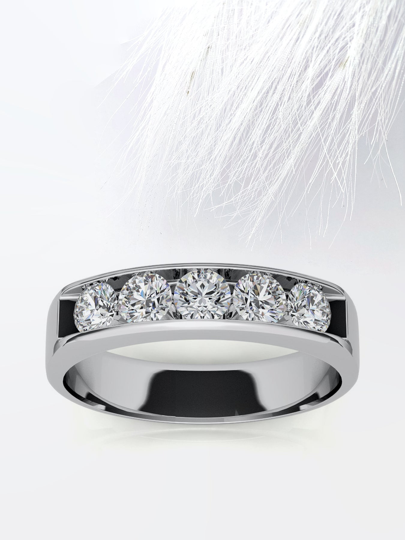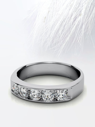 Introducing our Round Cut Five Stone With Channel Row Moissanite Men's Diamond Wedding Band, a striking blend of elegance and sophistication designed to symbolize eternal love and commitment. Crafted with precision and care, this exquisite wedding band features five dazzling round-cut Moissanite stones set within a sleek channel row, creating a timeless and captivating design. The Moissanite stones, renowned for their brilliance and durability, are expertly selected to ensure maximum sparkle and brilliance, making this band a truly breathtaking addition to any woman's jewelry collection. Whether worn as a symbol of devotion or as a stunning fashion statement, this wedding band exudes undeniable charm and elegance, perfect for commemorating the bond shared between two hearts. Elevate your special day with this extraordinary piece that captures the essence of romance and enduring beauty.